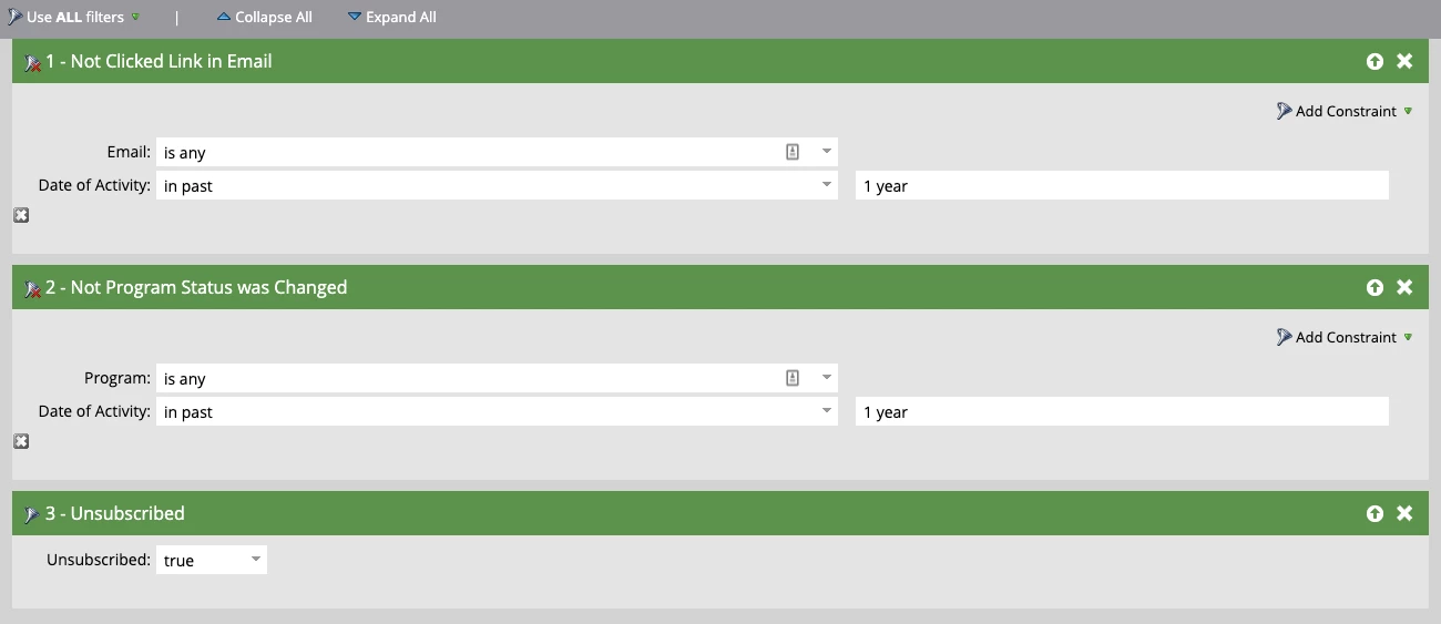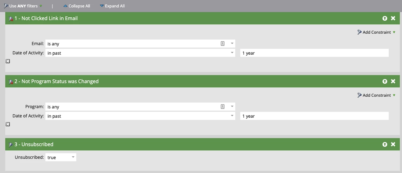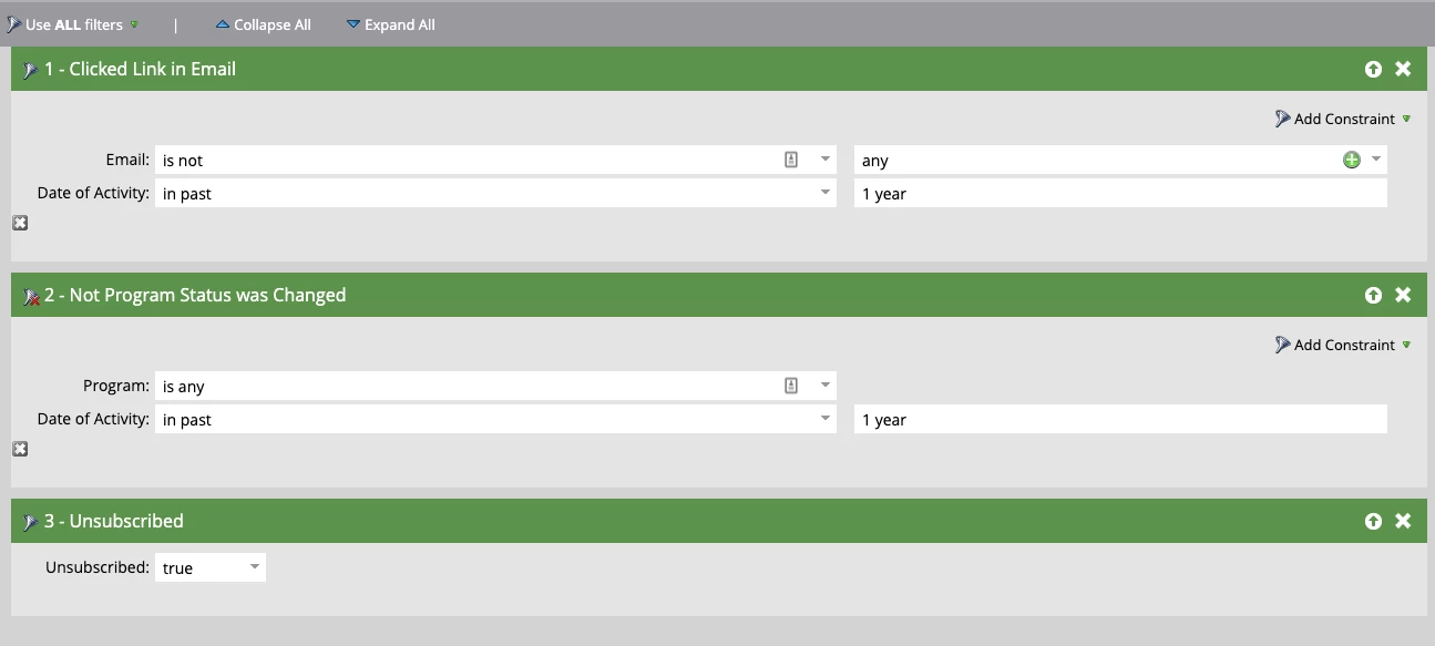 - You would like to start purging stale data in your database, and you’d like to start by looking at leads that have not been added to a program and not clicked a link in any email in the last year and are also unsubscribed. What would your Smart List filters look like?