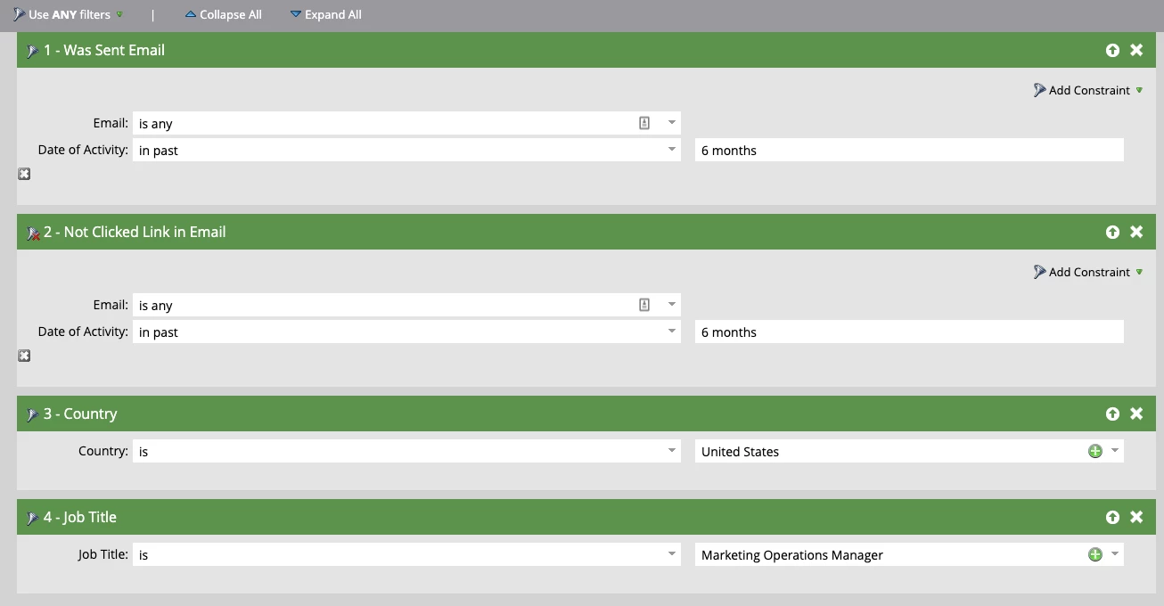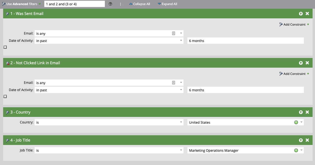 - A marketer would like to run a re-engagement campaign on any people within the database who have been sent emails within the last 6 months and have not clicked links in an email in the past 6 months. They would also like to add the additional criteria that the person is either in the US OR have a title of Marketing Operations Manager. What would their Smart List filters look like?