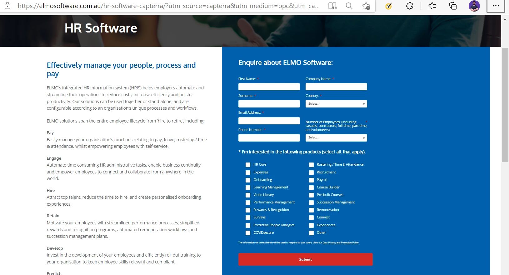 We have encountered an error with the form on this page - https://elmosoftware.com.au/hr-software-capterra/?utm_source=capterra&utm_medium=ppc&utm_campaign=human-resources&utm_content=NZ