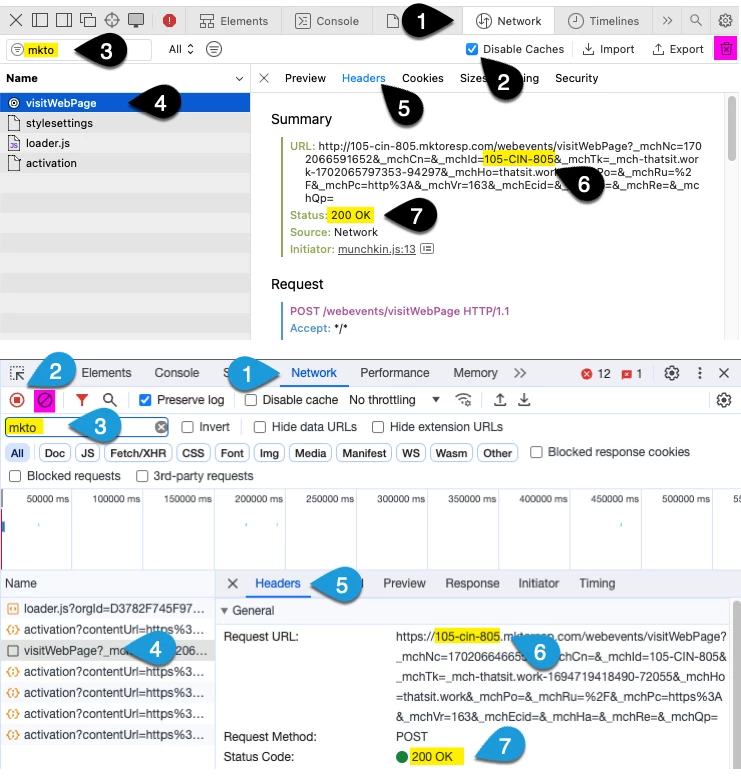 Once we are in the the tools we want to click on the "Network" tab. This may display nothing or a lot of junk that may mean nothing to you. This isn't a lesson the developer tools, but here is enough to find what you need. You will want to make sure the activity is saved long enough for you to read it. Also, you will want to filter the activity so you you can find what's important. Start by opening the page the at you wan to verify its having the Munchkin code loaded and running properly, and ope the developer tools. Here are screenshots of Safari (top) and Chrome (bottom) with a description of the numbered points below.