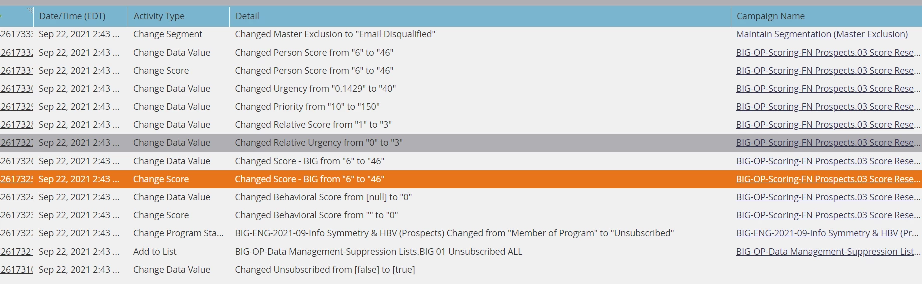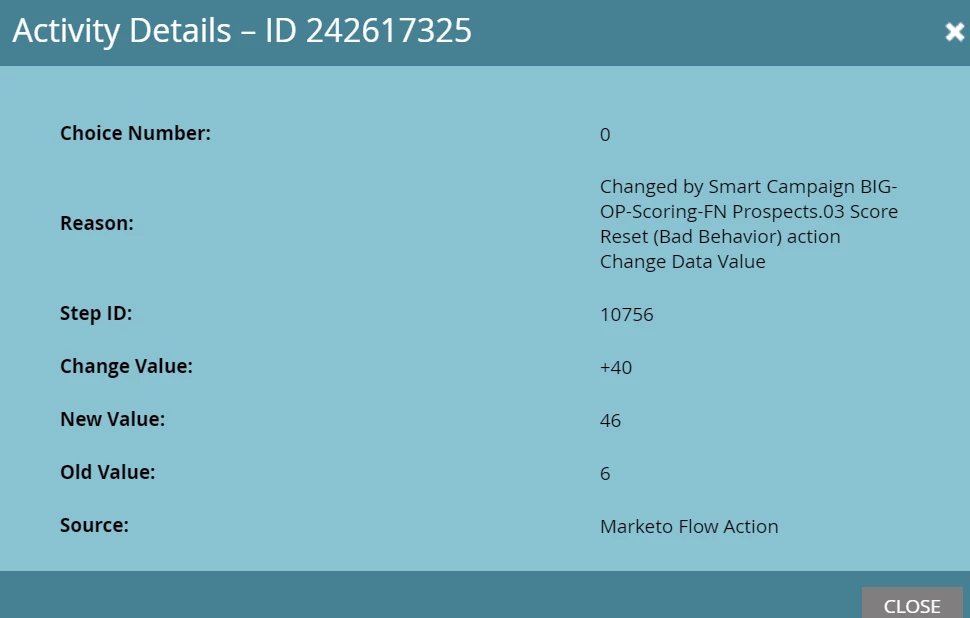 As you can see the campaign made this one lead score jump 40 points. The lead got +40 for unsubscribing, which obviously isn't supposed to happen: