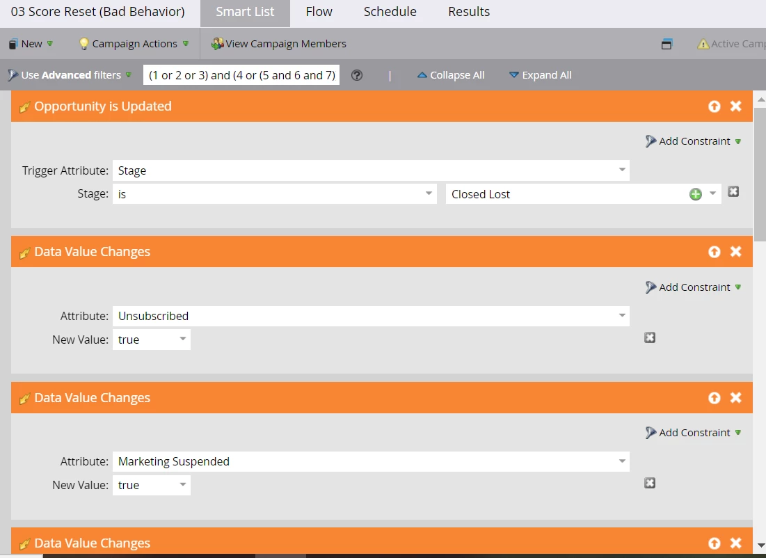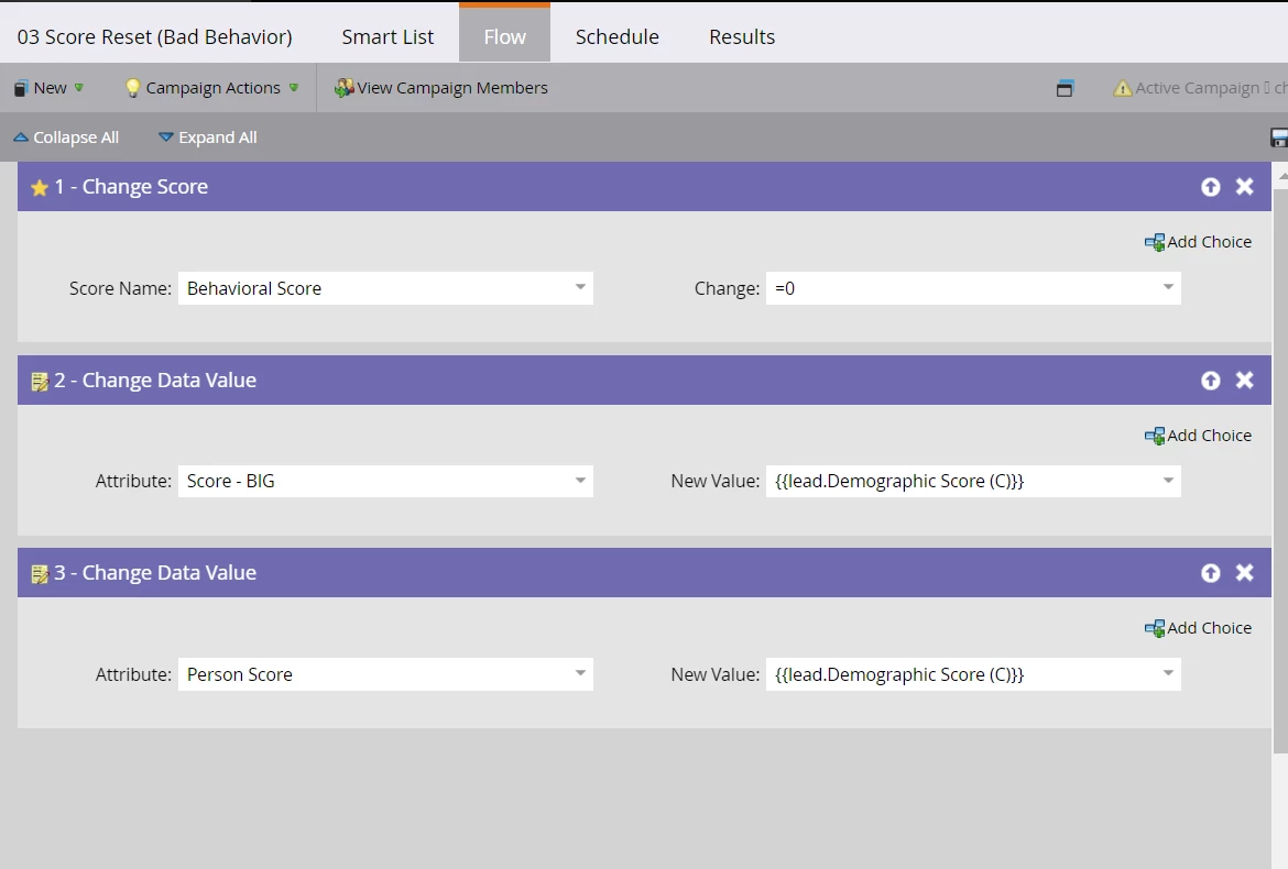 I recently took ownership of a lead scoring program that was created under my predecessor. As part of the program, she had built a Bad Behavior smart campaign, meant to reset the overall lead score "Score - BIG" to equal just the "Demographic Score". Essentially, the campaign removed "Behavioral Score" from the "Behavioral Score" + "Demographic Score" = "Score - BIG" equation. It is meant to run when someone unsubscribes, is Marketing Suspended, Email Invalid, etc.