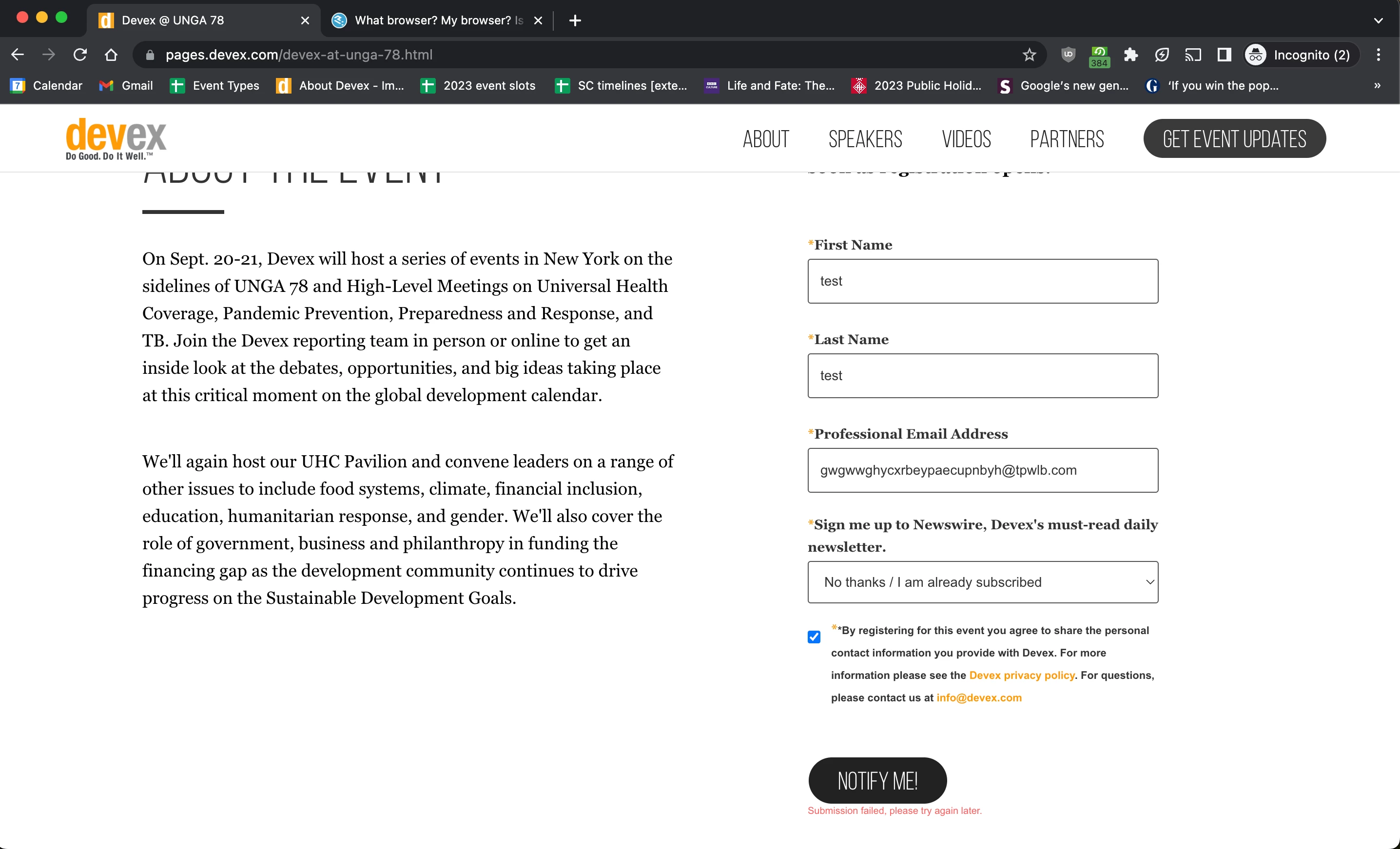 I have a Marketo page where when some users fill out the form, they get an error message that says "submission failed, please try again". However it is strange because this seems to happen with only certain email addresses, and 156 people have been able to fill out the form successfully on this page without receiving the error message. When I use my professional email address, I don't receive the message, but when I use my person gmail address, I do.