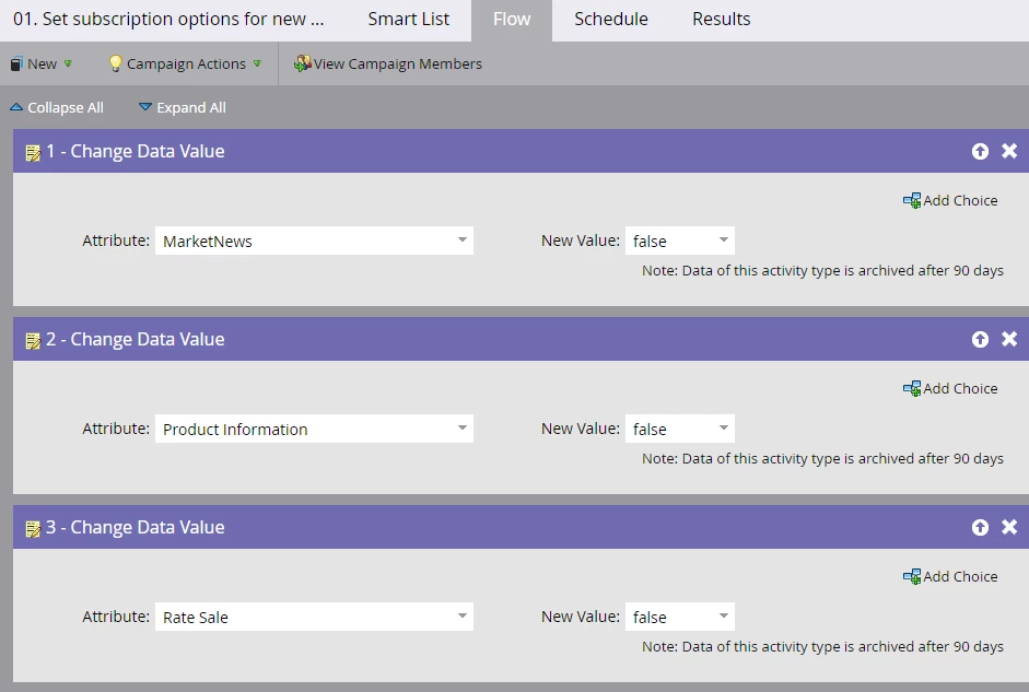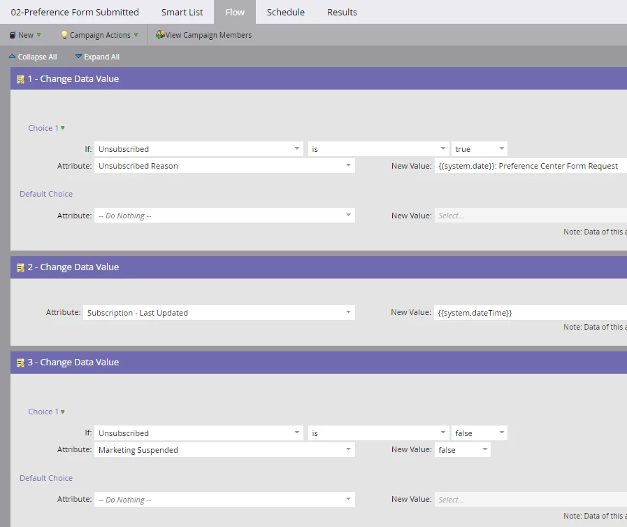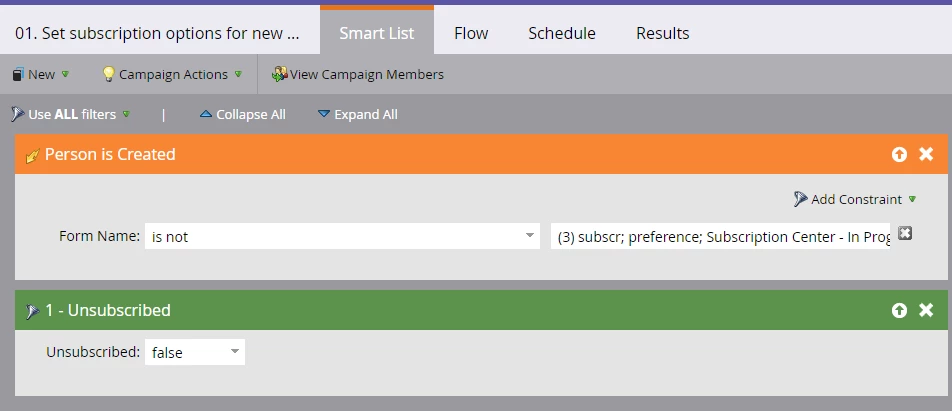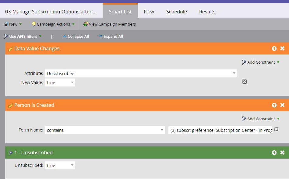 Looking at your initial screenshot, my comment would be that this is inverse logic which makes it more difficult to think about and understand. Given that it's a subscription centre, you'd normally expect to be able to opt IN to things, rather than just be presented with a list of things to opt OUT of. For example - presenting an option that says 'I want to opt out of product information' means that the customer has to do a positive action (tick the box) to get a negative outcome (unsubscribe). It isn't technically wrong, but it does make understanding all of the smart campaigns and processing at the back end harder to grasp.