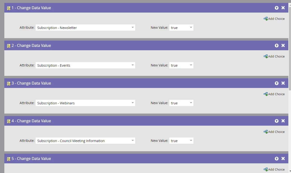 I can't seem to get my process to set subscription management choices for new people when they enter Marketo (most often from our CRM but not always). Does anyone know what I'm doing wrong here?