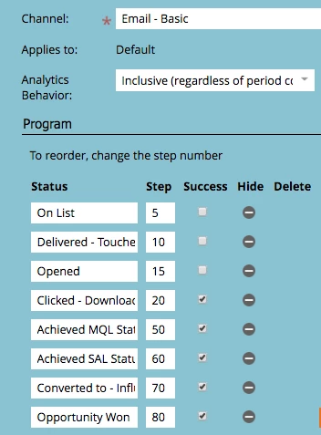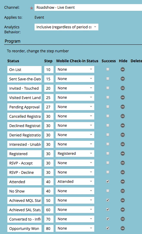 I want to have success TRUE for all Program status - Subscribed, Registered, Downloaded, attended, Attended - On demand but NOT FOR "clicked Email".