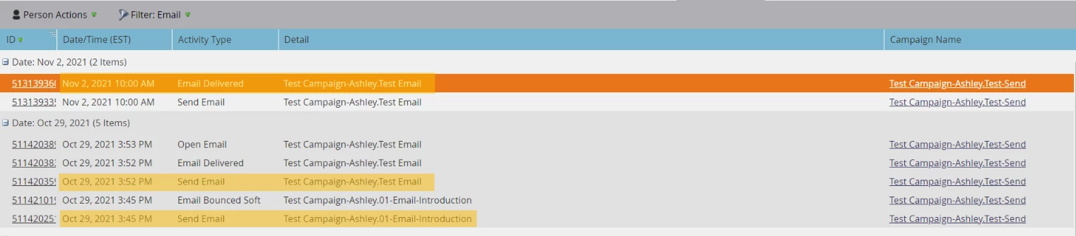 Notice the three email sends below. Two of the sends are via the same campaigns.