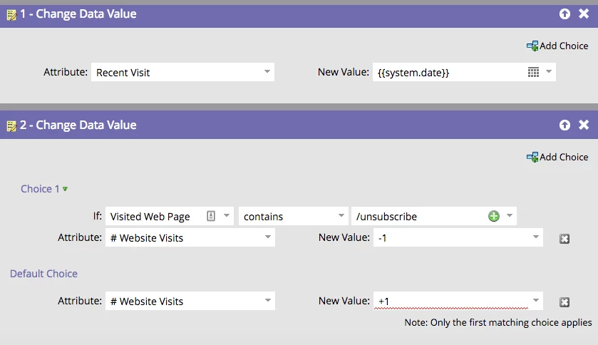 Using a custom integer field "# Website Visits", I set my flow to trigger a #1 each time a person visits our website (can pass through every 1 day).
