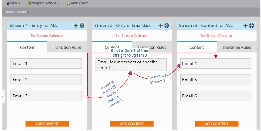All leads that qualify to be added to the engagement program via the flow will need to get the same emails in stream 1. Only specific leads need to get the content in the second stream. I have created a smart list that contains all leads that need to receive this email.