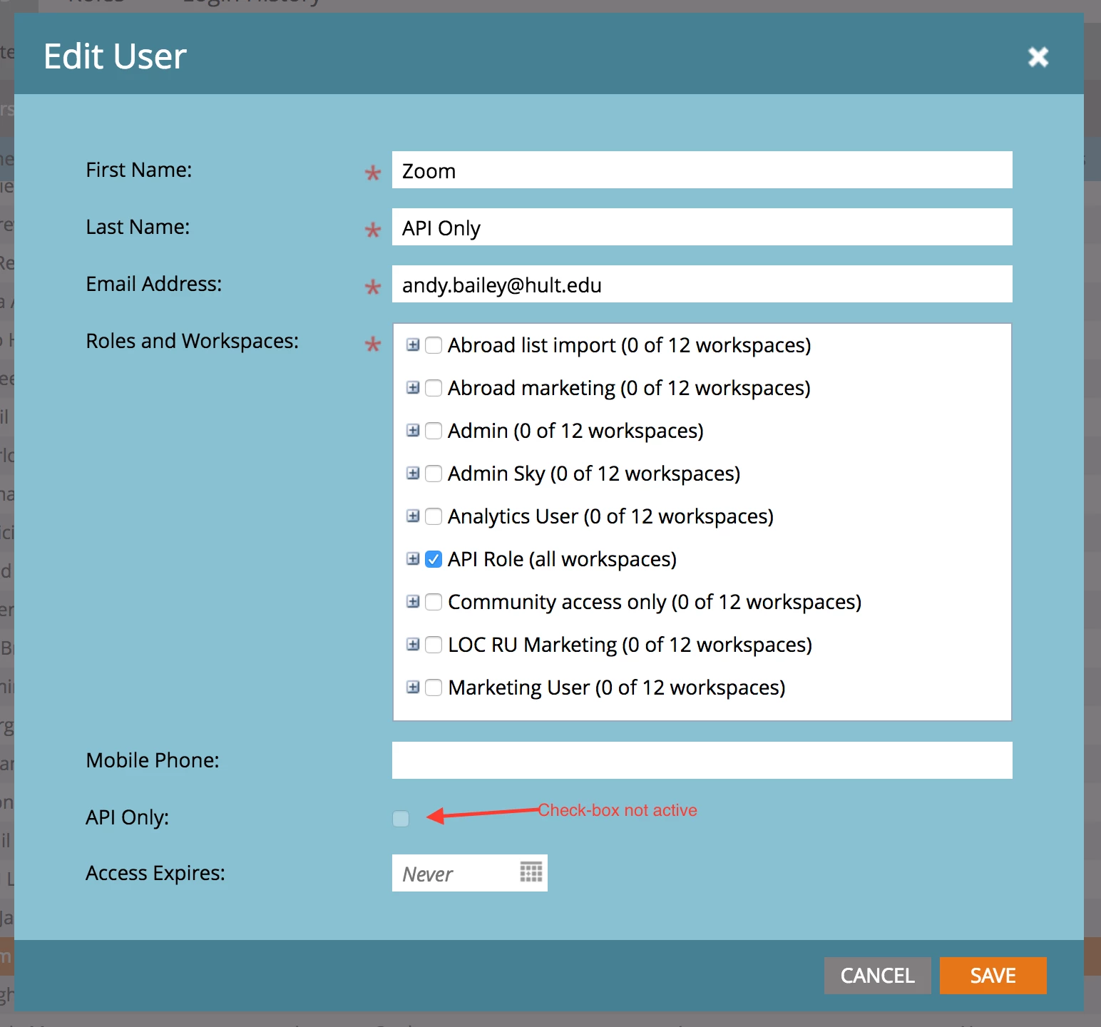 I have created an API Only role as per documentation. Now trying to create an API Only user. have assigned to API Only role but unable to check the 'API Only' checkbox. It is simply uncheckable. Am I missing something?