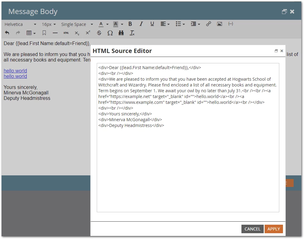 I have an email that looks like this where we want "hello.world" hyperlinked (for example):