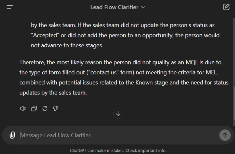 For some reason, a person who filled out a contact us form did not make it to sales because the person did not MQL. The sales team got to know about this during a reporting discussion, and is now asking about why a person who filled out the contact us form did not MQL? The usual way is to go through the flow charts, smart campaigns, brainstorm and troubleshoot. However, let’s try asking our AI Agent, aka GPT.