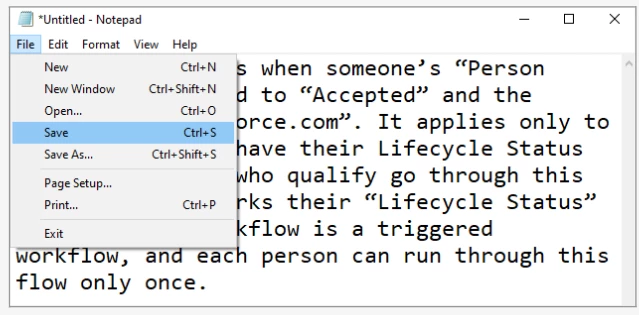 This workflow runs when someone’s “Person Status” is updated to “Accepted” and the source is “salesforce.com”. It applies only to those people who have their Lifecycle Status as “MQL”. People who qualify go through this workflow which marks their “Lifecycle Status” as “SAL”. The workflow is a triggered workflow, and each person can run through this flow only once.