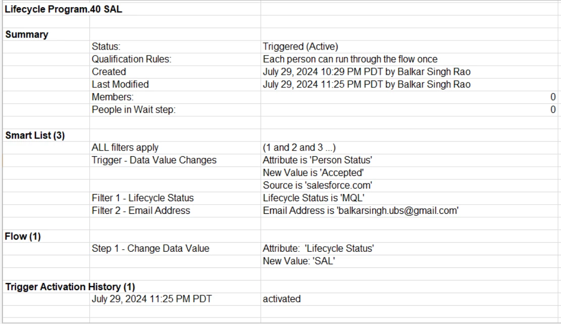 You can see it lists details about its type - whether it’s triggered, or batch. It clarifies qualification rules. It also mentions the member count. In addition, it specifies the criteria which qualifies people to run through it. In this case, it specifies if “Person Status” changes to “Accepted” via salesforce.com, and if “Lifecycle Status” is “MQL”, the smart campaign will update the “Lifecycle Status” to “SAL”.