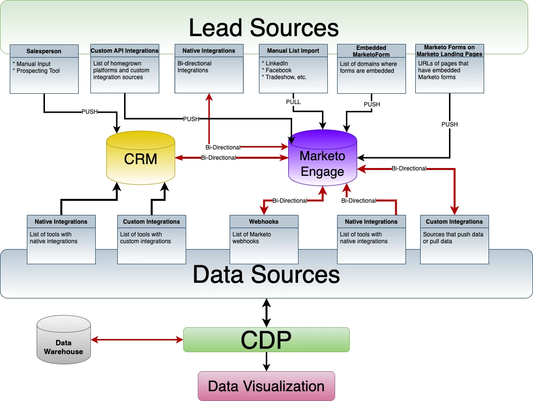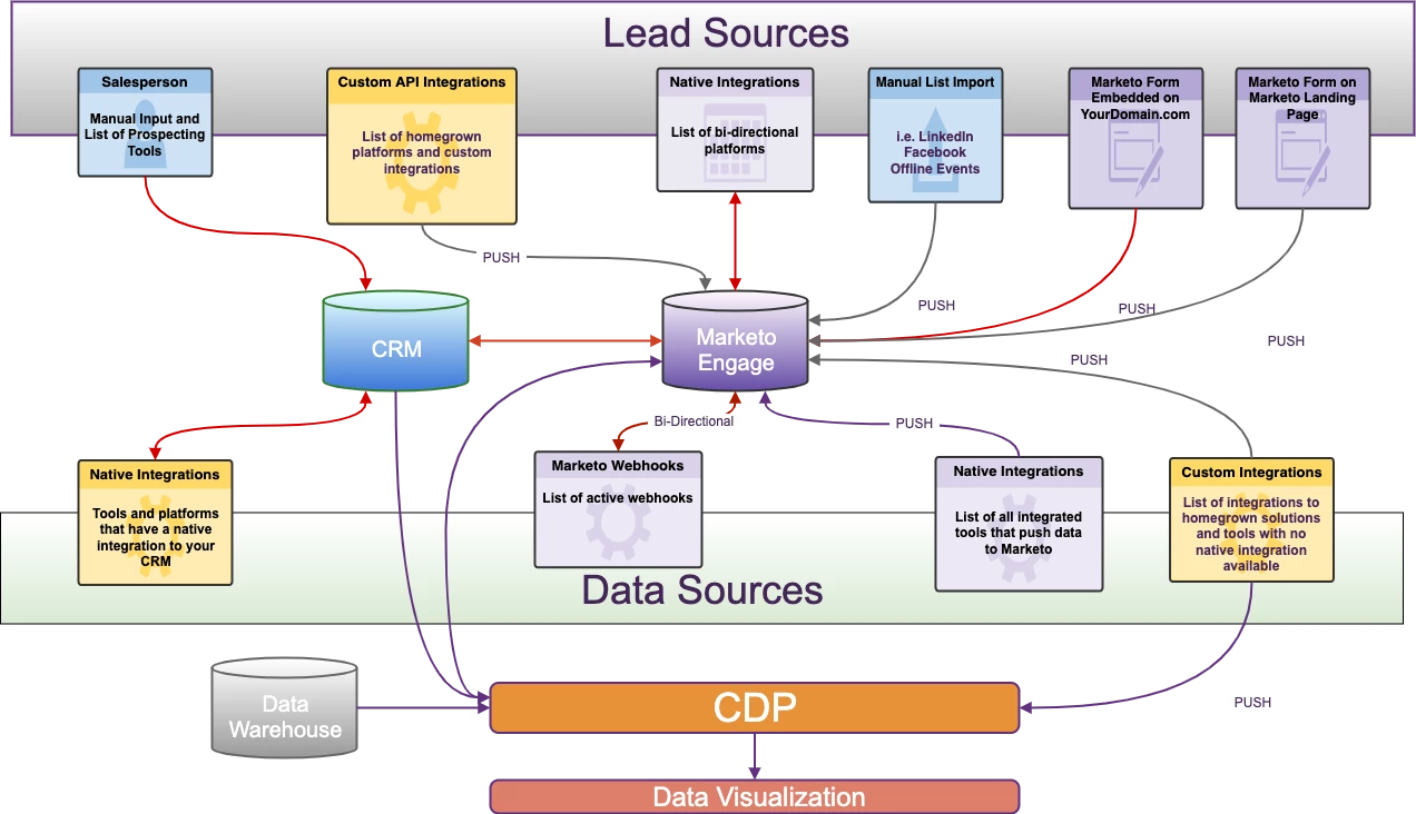 This diagram was born out of necessity when I started a new job where I was responsible for cleaning up and maintaining a Marketo Engage instance that had been around for many years and had many cooks in the kitchen. After a quick audit of the instance, I decided to tackle the issue of the thousands of API errors I was seeing daily. I asked for an architecture diagram, so I could see all of the lead and data sources that could potentially be causing the errors, and one didn’t exist. So, I created one.