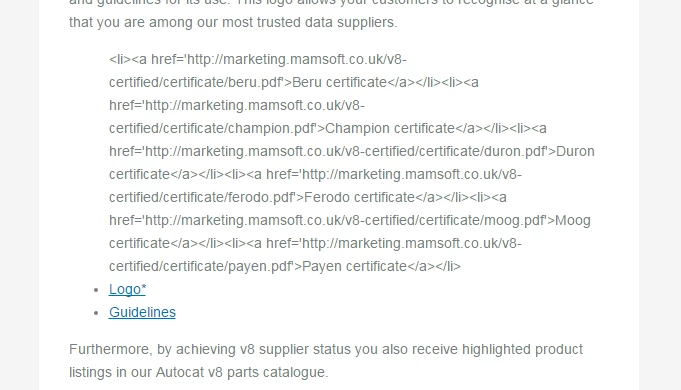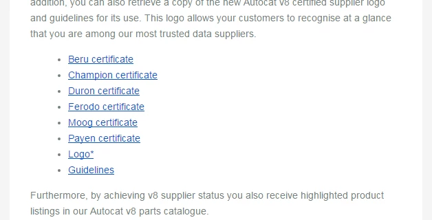 <li><a href='marketing.mamsoft.co.uk/v8-certified/certificate/beru.pdf'>Beru certificate</a></li><li><a href='marketing.mamsoft.co.uk/v8-certified/certificate/champion.pdf'>Champion certificate</a></li><li><a href='marketing.mamsoft.co.uk/v8-certified/certificate/duron.pdf'>Duron certificate</a></li><li><a href='marketing.mamsoft.co.uk/v8-certified/certificate/ferodo.pdf'>Ferodo certificate</a></li><li><a href='marketing.mamsoft.co.uk/v8-certified/certificate/moog.pdf'>Moog certificate</a></li><li><a href='marketing.mamsoft.co.uk/v8-certified/certificate/payen.pdf'>Payen certificate</a></li>