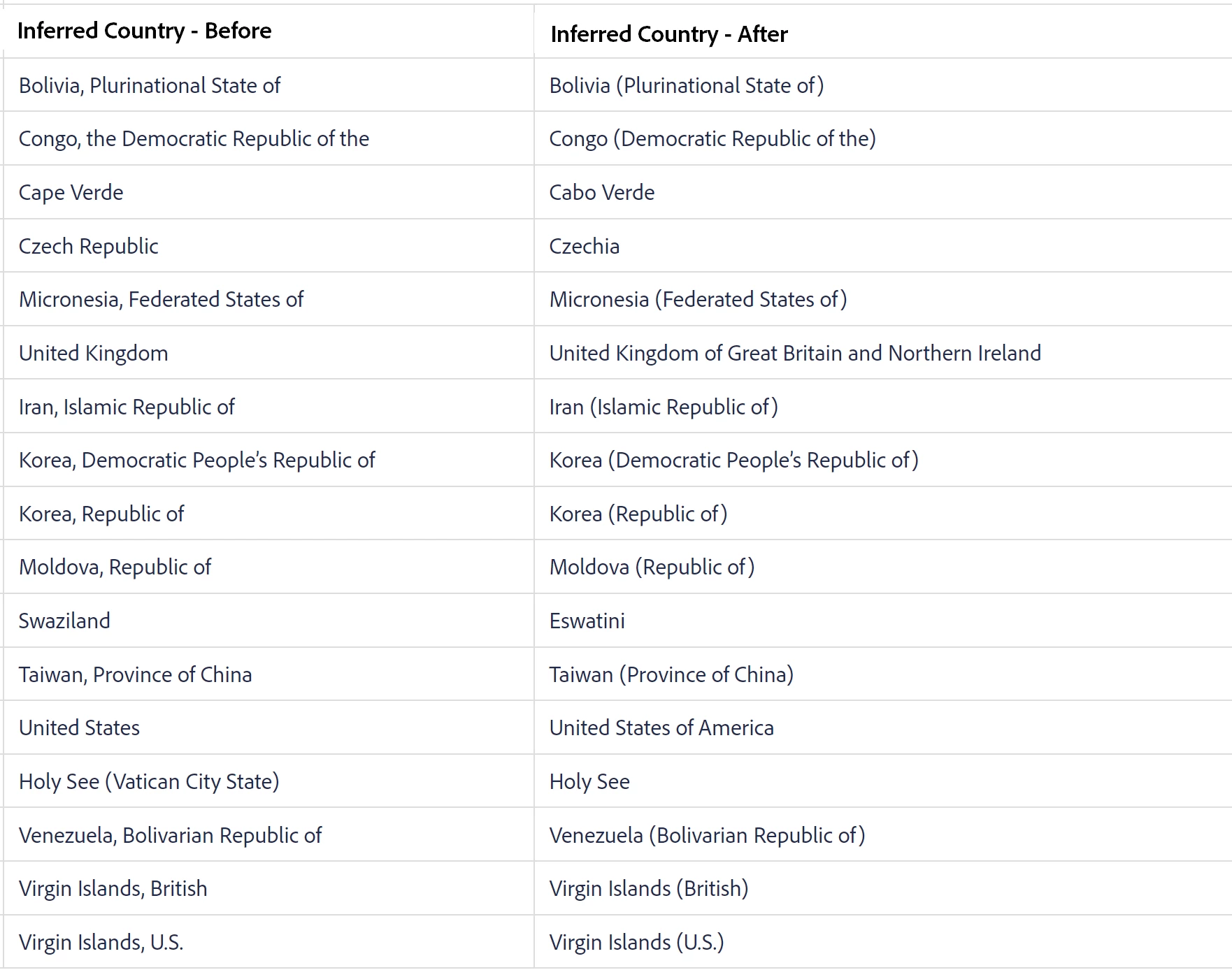 In the March 2023 release, Marketo Engage will be changing several values used to populate the Location/Country field at multiple sections in Web Personalization and Predictive Content Modules. These sections include Segment Creation Page, Organizations List Page, Leads List Page, Analytics – Visitors List Page, User Settings – Edit Regions Page, Content Analytics – Analytics Page (in Predictive Content).