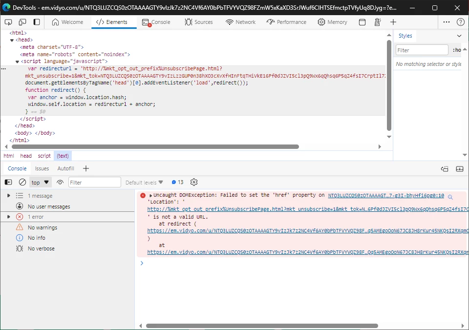 Using the mailto link successfully unsubscribes but the URL sends us to a page that contains an error. Is that link going to a page Marketo customers manage? There is an "unresolved" token in the redirect variable in the script.