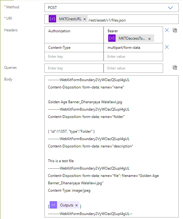 I am trying to get the teams to upload the image via a Microsoft Form, and through a PowerAutomate flow, I am trying to do an HTTP request to upload that file into Marketo.