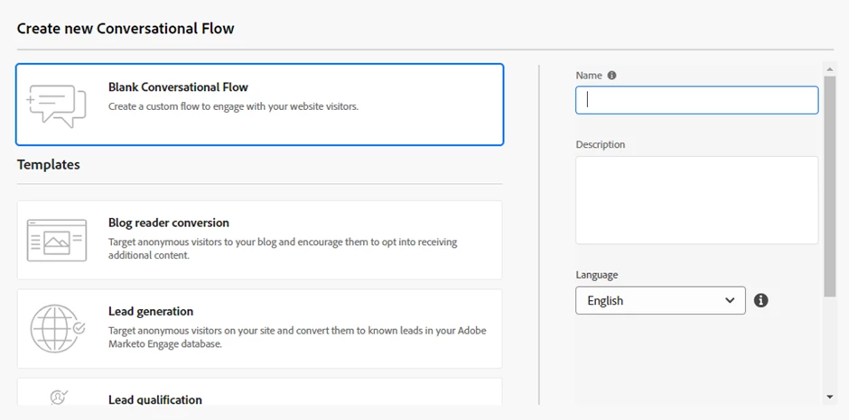 Next, you will need to give your Conversational Flow a name and choose a template. There are a variety of templates available, depending on your needs. For example, there are templates for qualifying leads, providing customer support, and upselling and cross-selling.