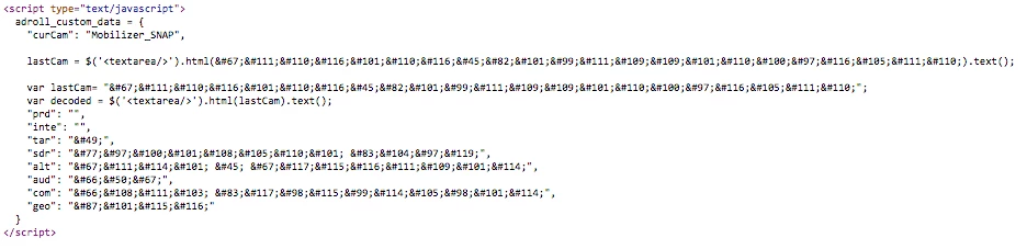 Here's an example of what I'm trying to pass to AdRoll. I have two different versions, one like Matt said, and a second to try a different way!