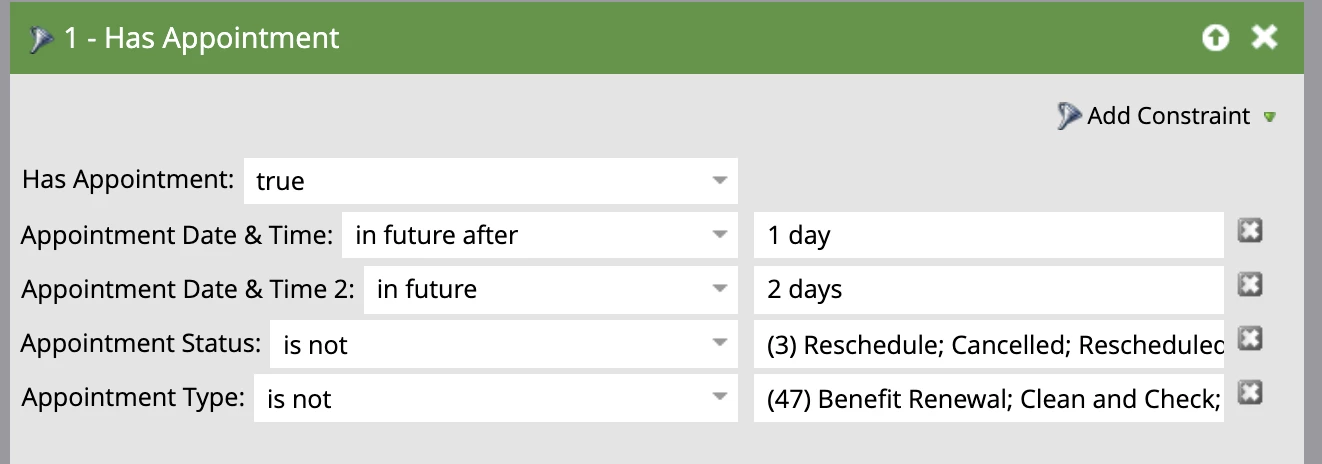 The objective is to exclude the above appointment types and statuses from the email send. I am hoping this just a simple syntax error. Thanks to anyone that is able to have a gander.