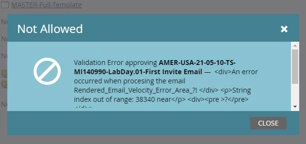 Hi there, I'm a bit new to the Marketo world and email HTML, but familiar with both. When editing the text-only version of my finished email, I am unable to send myself a sample nor approve the email for send-out. The error that pops up states there's a "velocity script error." I've removed any $coding from the text-only version, but this does nothing. Anyone have any suggestions?