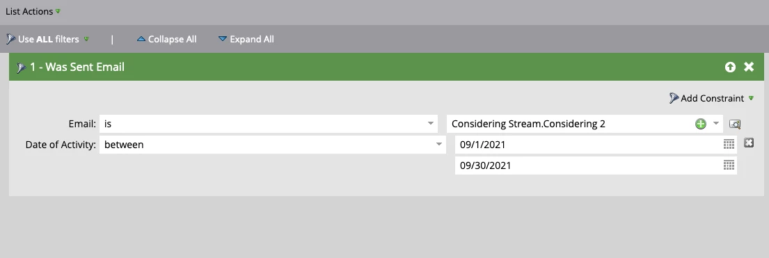 I am using a "Was Sent Email" filter to show contacts sent a specific email "between" two dates. This is my only filter