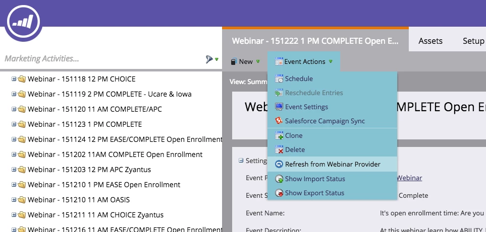 We use GoToWebinar to host our webinars and I noticed our most recent one that I set up and completed showed that no one attended or "no-showed" which I know is not the case because of the report that gotowebinar provided to me. I looked at previous webinars that were set-up by someone else in my company and it does show the attended and not attended. Does anyone have any suggestions or thoughts on how to resolve that? Thank you!