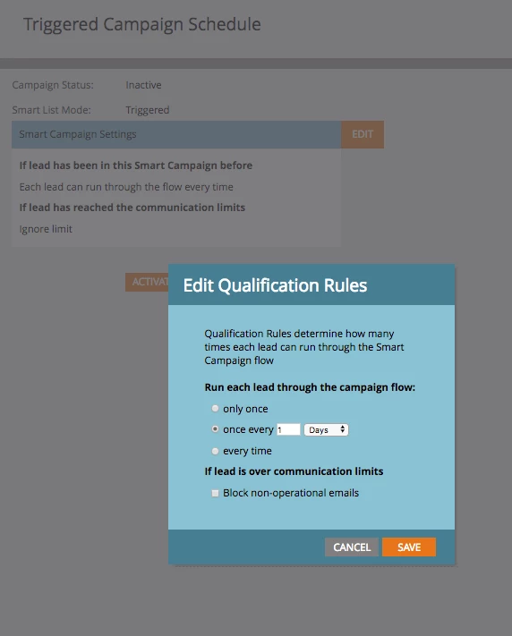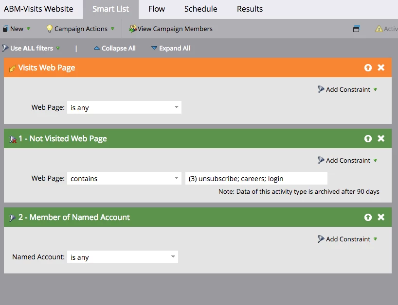 I'm setting up some alerts for my sales reps to get a gauge to when Named Account prospects visit the website. My problem with this setup in the screenshot is, the rep will be alerted to every webpage the prospect visits. I really just want one alert for an overall website visit. I'm not fully sure if adding a constraint will provide this or in the schedule tab, I should just have a prospect run through the campaign once an hour.