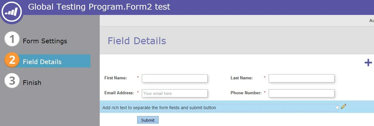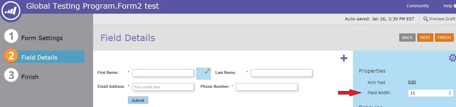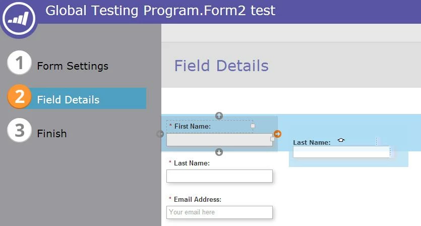 In the example screenshots below, I clicked and held on the form field Last Name and hovered to the right of First Name (notice the arrows around first name and the one highlighted on the right side in orange). When I released the mouse button, the form field last name dropped in right next to first name.