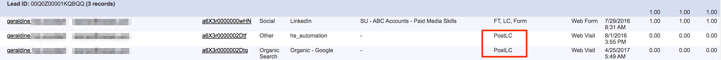 So, back to the point, what is PostLC? PostLC is a Touchpoint Position value that Marketo Measure assigns when it’s a Touchpoint that has happened, but it happened after the point of Lead Creation (LC). Essentially this means that any Touchpoints marked PostLC will not be eligible for attribution credit in the attribution models that apply to the top of the funnel (First Touch, Lead Creation, and U-Shaped), which makes sense since these models only go up to the point of Lead Creation. The screenshot lower shows this.