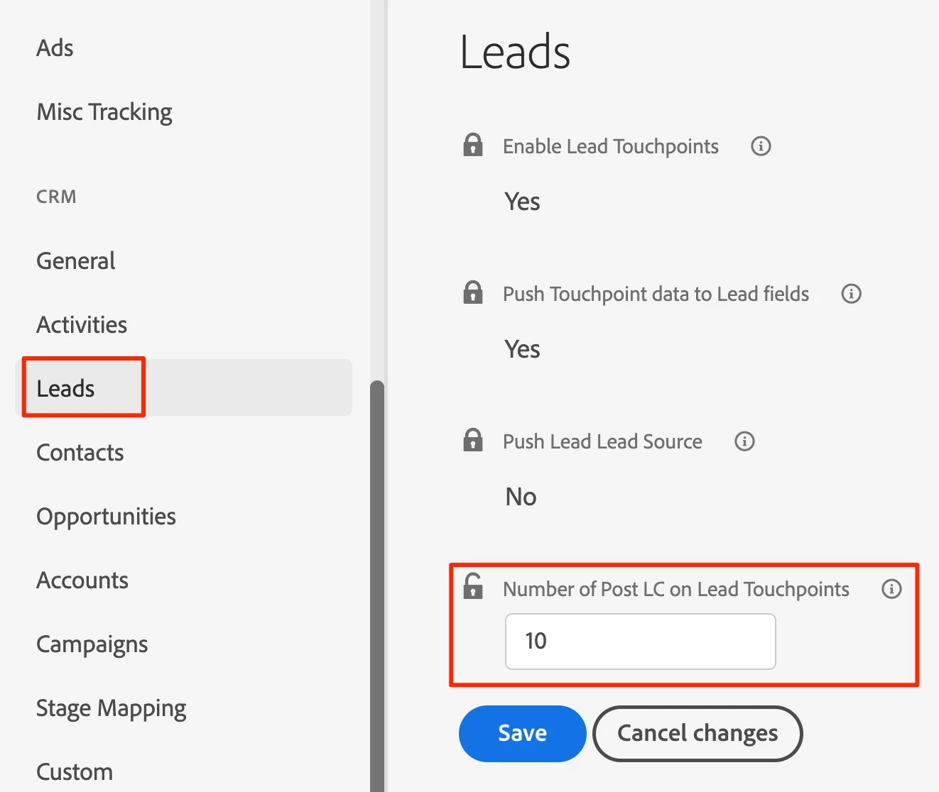 In Marketo Measure under the CRM section, in either the Lead or Contact subsections, you can alter these limits as needed. Simply click the lock icon next to the input box for “Number of Post LC on Lead/Contact Touchpoints” and enter your new number. Don’t forget to click Save!