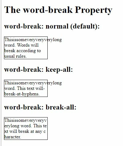 Another similar style that could be causing the same issue is word-wrap: CSS word-wrap property -- that'd work similarly, but with "word-wrap:normal;" instead of word-break.