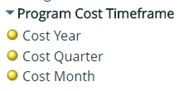 you use the Program Cost Timeframe dimension. In the Program Opportunity Analysis report, opportunity-related timeframes are available, but in the other