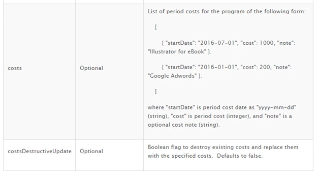 While you can enter period costs manually, it is also possible to populate period cost using the REST APIs for programs. The Update Program API call allows you to pass in cost information to an existing program. You can also create a program via the API using the Create Program API call, at which point you could choose to pass in the cost.