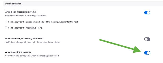 Also, if you've check-marked the "Notify host and participants when the meeting is canceled" option in Zoom (snapshot below), then the cancellation email would automatically go out to the registrants and the host upon event cancellation. So make sure that it is turned off if you're planning to send the cancellation notification from Marketo instead.