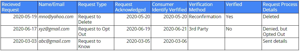 Though the the CCPA process is similar, the verification of Consumer is a mandatory requirement. In addition, the request to know or delete, needs to be acknowledged within 10 days, and information regarding how it shall process the request needs to be communicated. In this case, we need to make sure to follow up within 45 days.