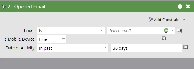 Create a smart list with open email or click email and Add Constraint Is Mobile Device is True, when its true you can see the list of people who opened email on Mobile and if you select False then these are the people who not opened on Mobile. If you want you can add more constraint which Device and which Platform