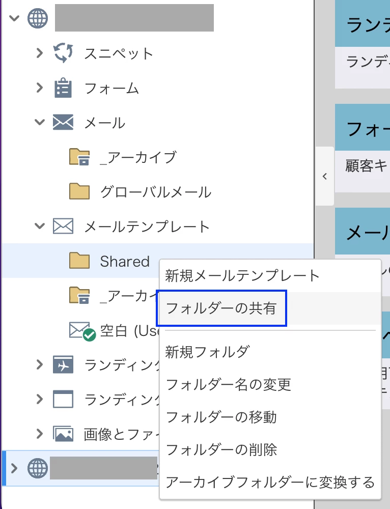 「マイテンプレート」を使用したメールアセットの場合、ワークスペース間を移動させるためには、テンプレートをフォルダに入れて、そのフォルダをワークスペース間で「共有」していただく必要があります。
