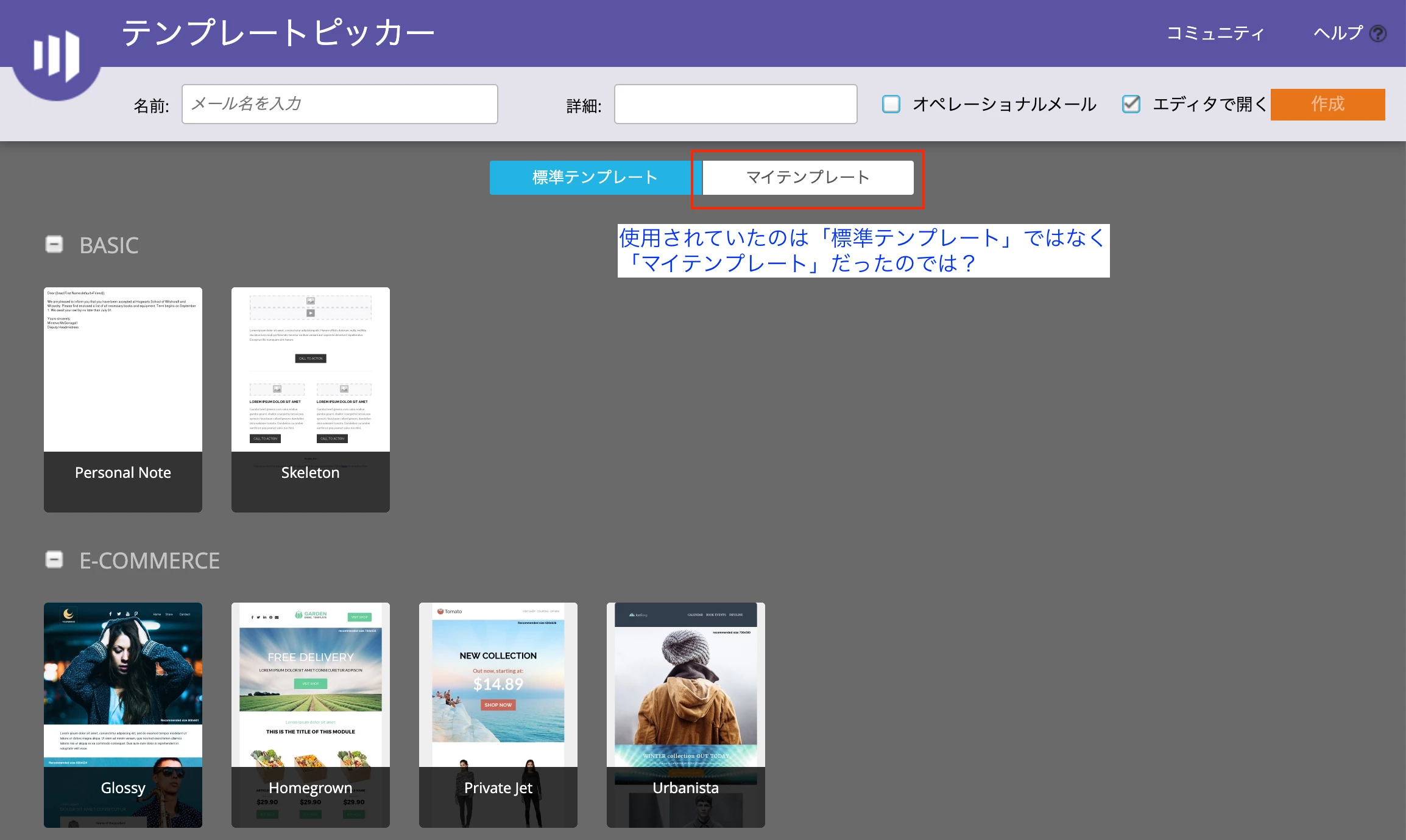 該当のメールアセットが使用しているテンプレートは「標準テンプレート」ではなく「マイテンプレート」ではないでしょうか?
