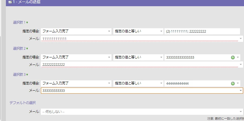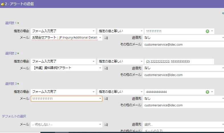 以下のように、複数種類のフォームの入力に合わせ、それぞれのアラートメールを配信しようとしています。