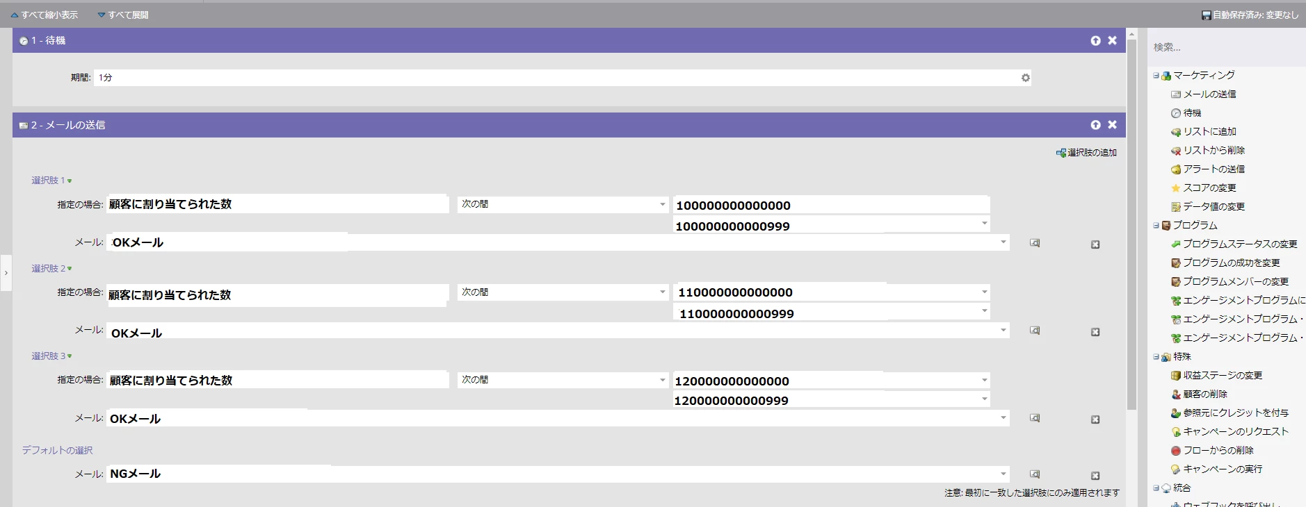 ・上記番号が以下の場合はOKメール、それ以外はNGメールを配信するよう設定