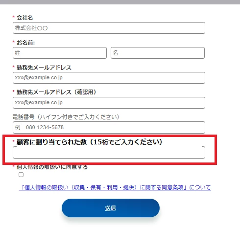・顧客に割り当てられた15桁の番号を入力いただくスペース