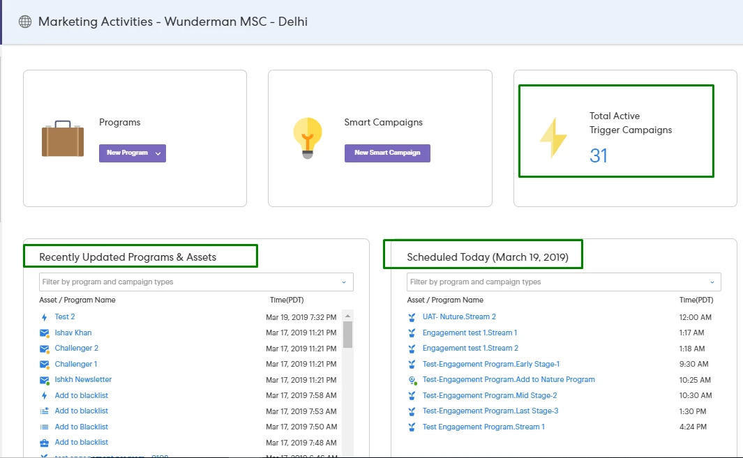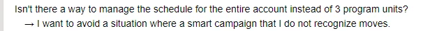 -"Unfortunately, there is no single view where you can manage / set the schedules for all the smart campaigns. You would need to set the relevant schedules by going to the schedule tab in the smart campaign. The "Marketo Moments" phone Alternative, you can use the Campaign Que (as highlighted below) to see as to which are the schedule that is scheduled. The Marketo Calendar app is also great to use to have a high level idea.