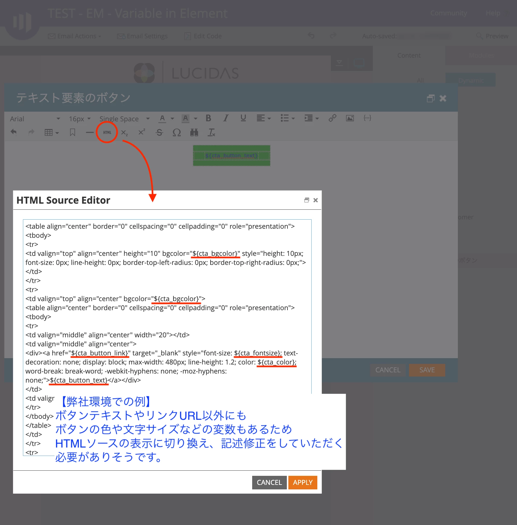 セグメント毎に変更する内容としてはテキスト(CTA Text)とリンク先(CTA URL)で、いずれも変数で値を設定する形になっています。
