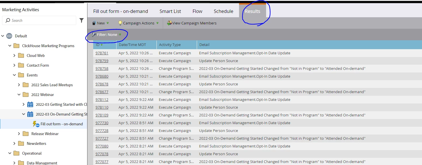 アラートを送信しているスマートキャンペーンの、Resultのタブで見れます。