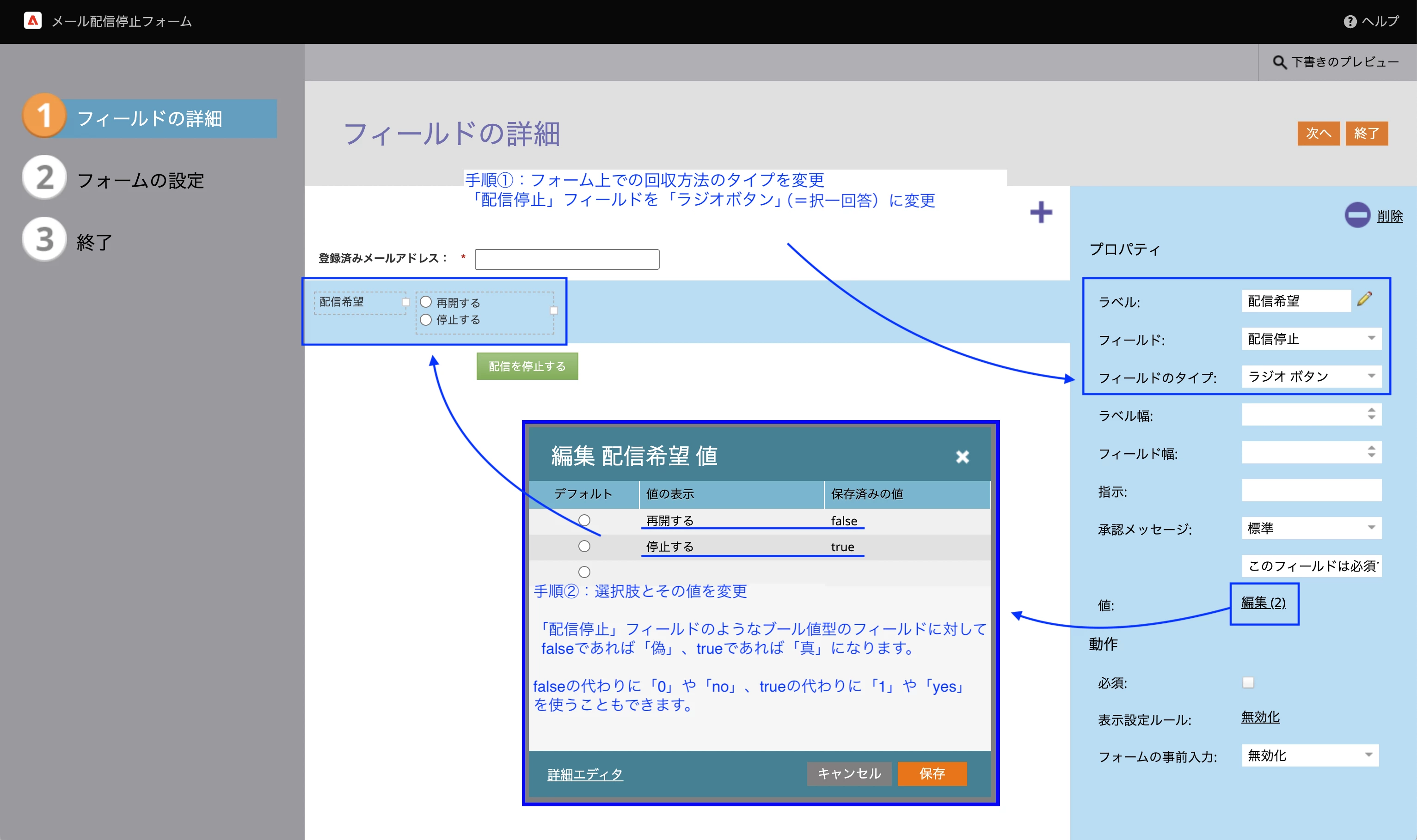 「配信停止」フィールドの回収方法を「ラジオボタン」にする