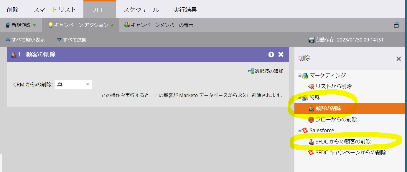 それとも添付画像の右下の方にある「SFDCからの顧客の削除」などが必要でしょうか?