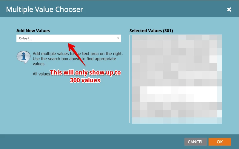 When selecting multiple values in a string field, it only shows 300 entries in the 'Select...' window.